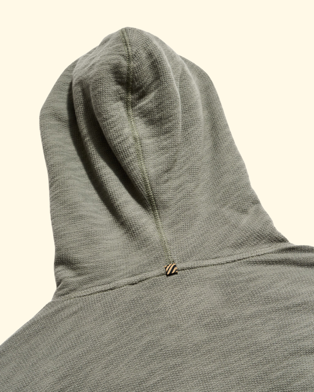100% cotton french terry knit that easily layers over your favorite tee or henley. Finished with signature Billy Reid details like leather toggles and our signature ribbon stripe clam shell at the back of the neck.