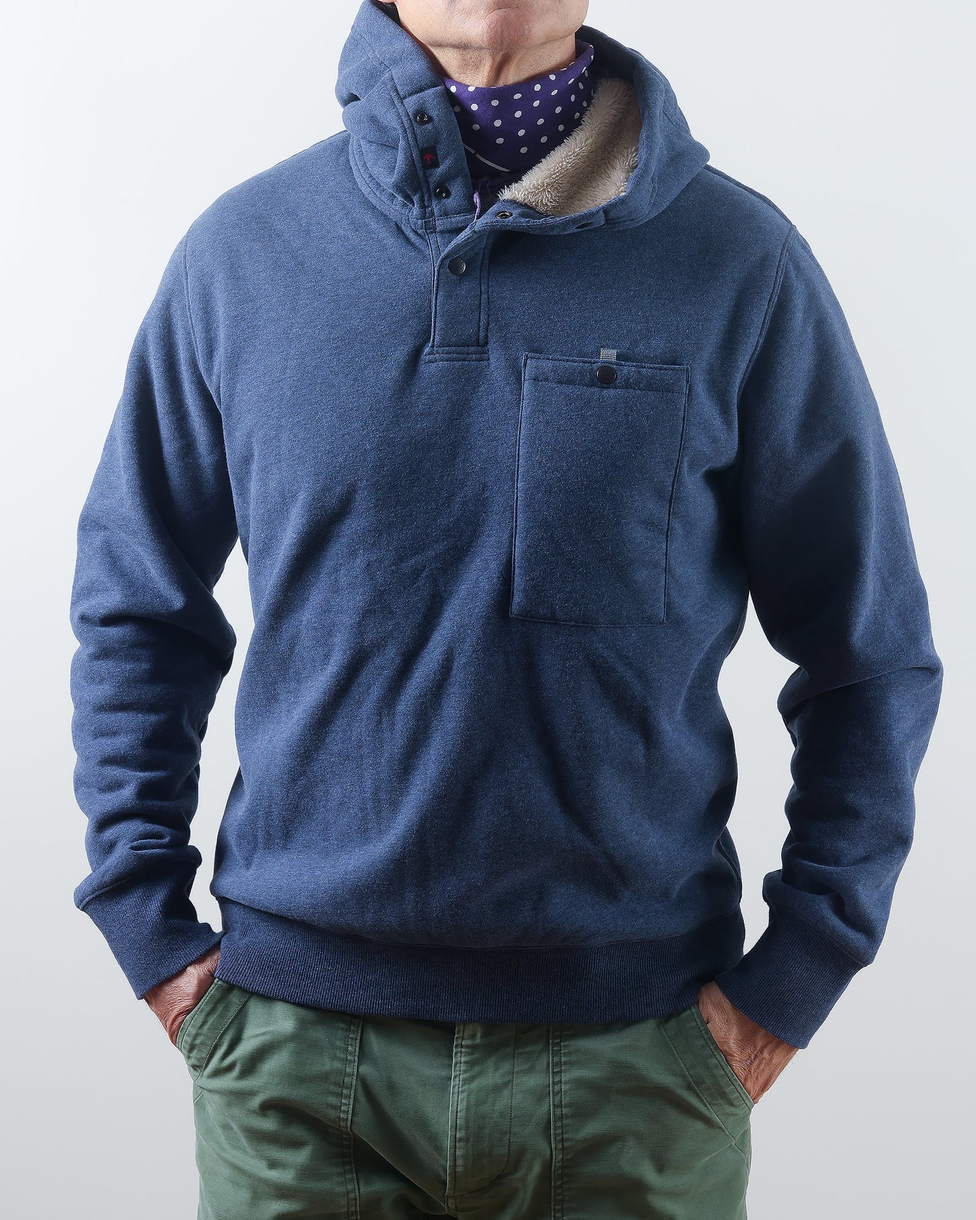 Cotton jersey face with lightweight shaggy pile backside, our iconic Hoodie in superfleece exudes great body and pliancy. Wear over a woven shirt with one snap closed and half-tucked at the waist for an unexpectedly refined look…because anyone can dress a hoodie down. Content: 100% cotton jersey face w/ lightweight sherpa 100% poly bonded backside. Classic fit.
